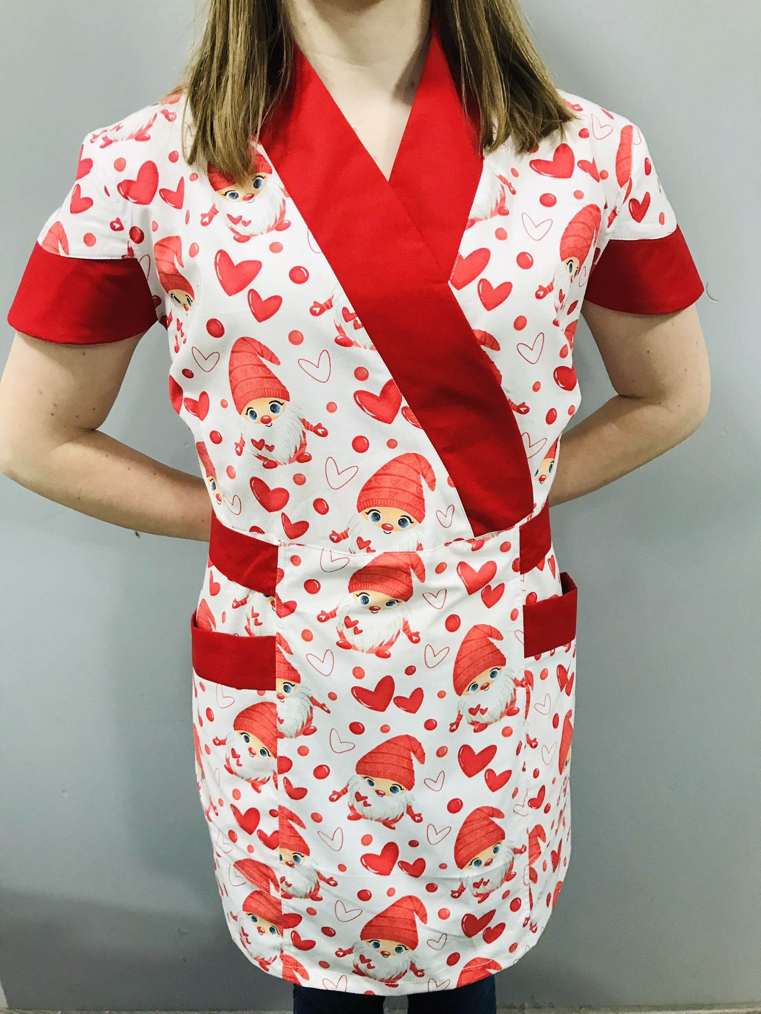 Termékeink 100% pamutvászon anyagból készülnek. Kényelmes, elől két zsebbel ellátott, egymásra simuló mellrész, ami V nyakat formáz a tunikának. Hátul a kötő segítségével egyéni méretre igazítható.