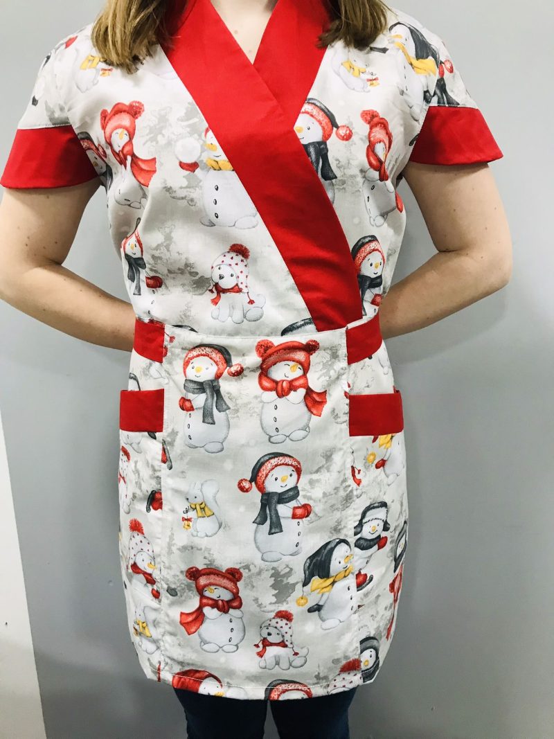 Termékeink 100% pamutvászon anyagból készülnek. Kényelmes, elől két zsebbel ellátott, egymásra simuló mellrész, ami V nyakat formáz a tunikának. Hátul a kötő segítségével egyéni méretre igazítható.