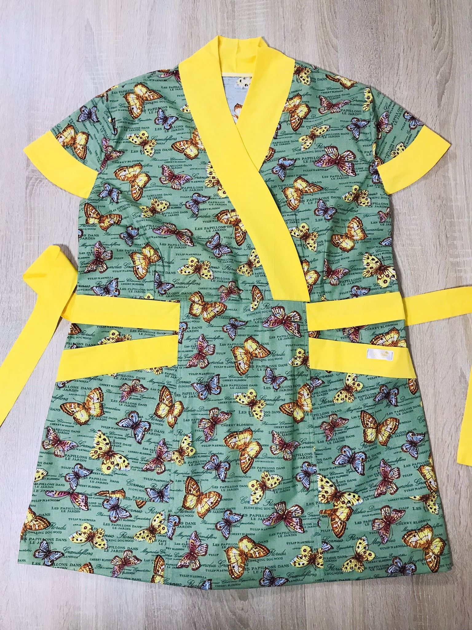 Termékeink 100% pamutvászon anyagból készülnek. Kényelmes, elől két zsebbel ellátott, egymásra simuló mellrész, ami V nyakat formáz a tunikának. Hátul a kötő segítségével egyéni méretre igazítható.