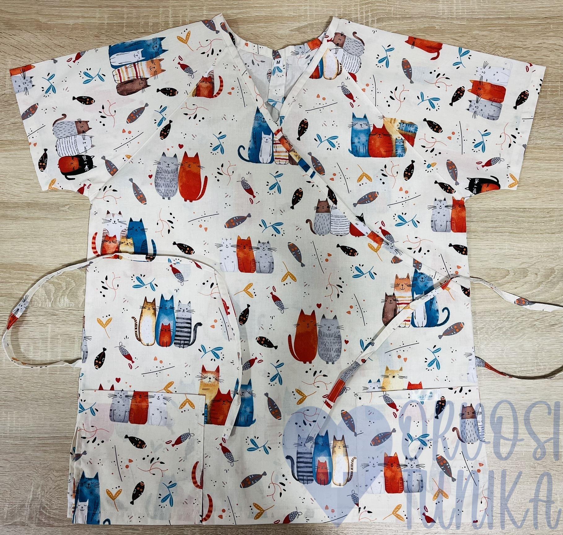 Termékeink 100% pamutvászon anyagból készülnek. Kényelmes, elől két zsebbel ellátott, V nyakú kivitelben. Hátul a kötő segítségével egyéni méretre igazítható. Oldalt hasíték teszi még kényelmesebbé.