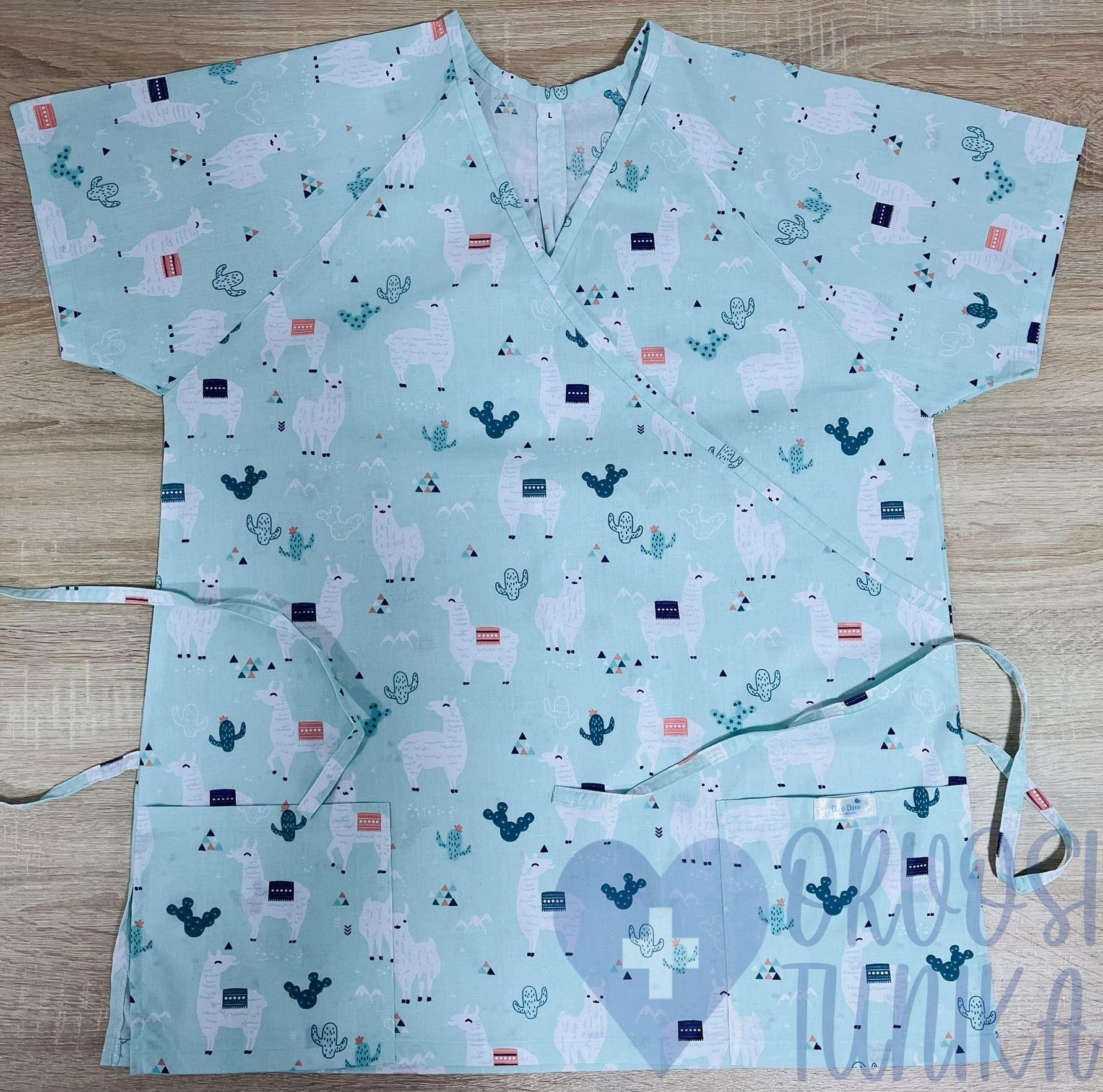 Termékeink 100% pamutvászon anyagból készülnek. Kényelmes, elől két zsebbel ellátott, V nyakú kivitelben. Hátul a kötő segítségével egyéni méretre igazítható. Oldalt hasíték teszi még kényelmesebbé.