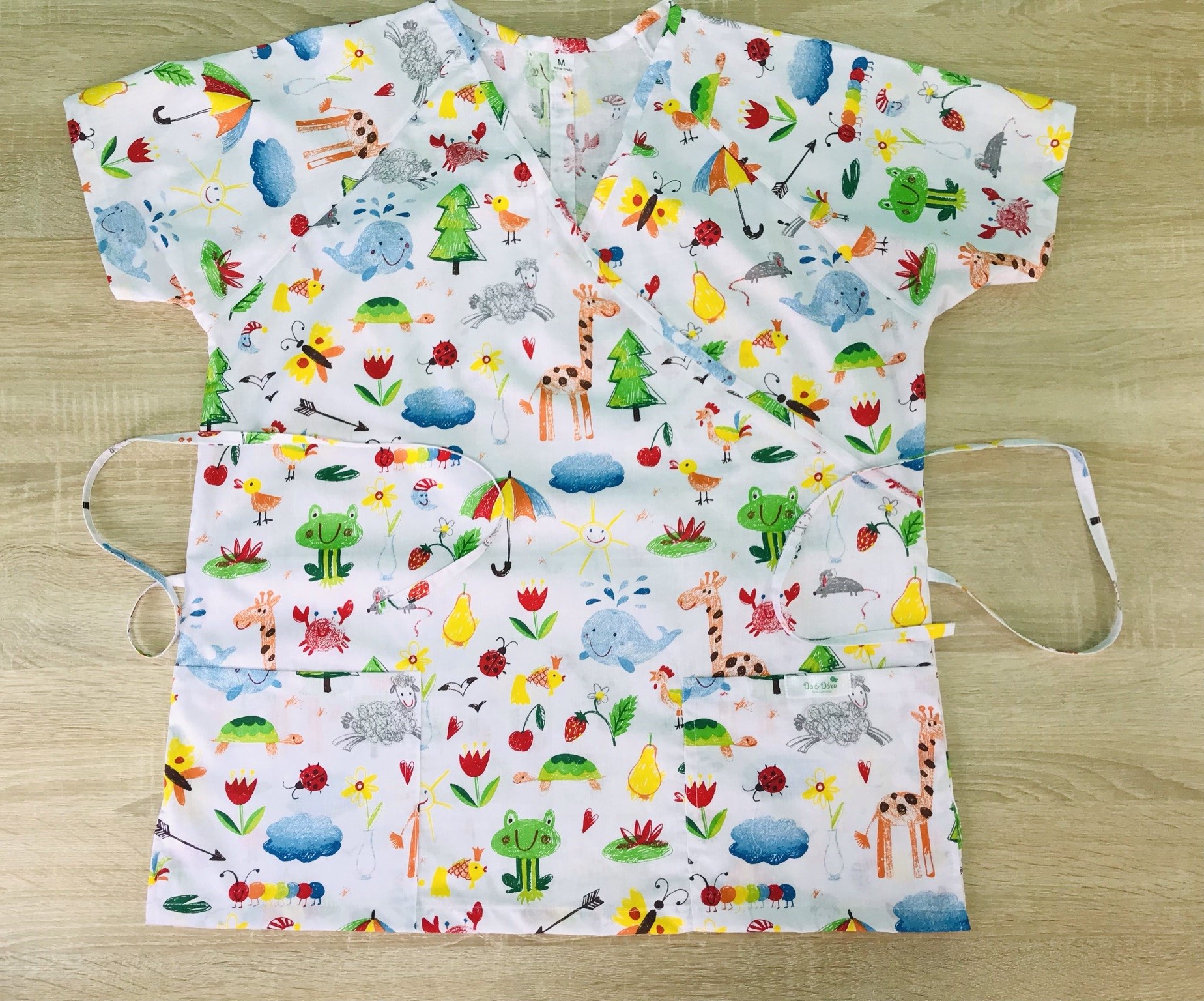 Termékeink 100% pamutvászon anyagból készülnek. Kényelmes, elől két zsebbel ellátott, V nyakú kivitelben. Hátul a kötő segítségével egyéni méretre igazítható. Oldalt hasíték teszi még kényelmesebbé.
